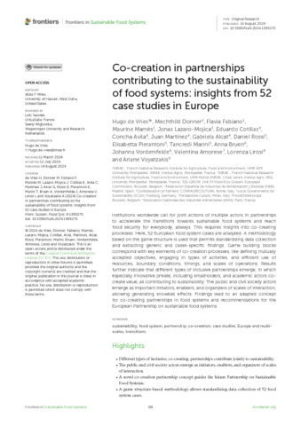 de Vries Hugo, Donner Mechthild, Fabiano Flavia, Mamès Maurine, Lazaro-Mojica Jonas, Cotillas Eduardo, Avila Concha, Martínez Juan, Alcat Gabriela, Rossi Daniel, Pierantoni Elisabetta, Marini Tancredi, Bruen Anna, Vordemfelde Johanna, Amorese Valentina, Lirosi Lorenza, Voyatzakis Ariane. 2024. Co-creation in partnerships contributing to the sustainability of food systems: Insights from 52 case studies in Europe. Frontiers in Sustainable Food Systems, 8, 12 p.