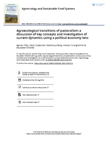 Frija Aymen, Carpentier Irène, Alary Véronique, Ouerghemmi Hassen, Dhehibi Boubaker. 2025. Agroecological transitions of pastoralism: A discussion of key concepts and investigation of current dynamics using a political economy lens. Agroecology and Sustainable Food Systems : 1-26.