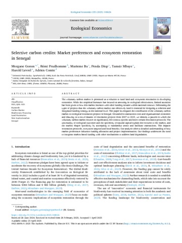Gonon Morgane, Prudhomme Rémi, Ba Marieme, Diop Penda, Mbaye Tamsir, Levrel Harold, Comte Adrien. 2025. Selective carbon credits: Market preferences and ecosystem restoration in Senegal. Ecological Economics, 235:108626, 13 p.