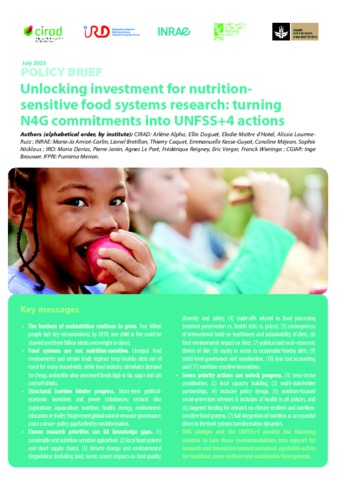 Alpha Arlène, Daguet Ellie, Maître d'Hôtel Elodie, Lourme-Ruiz Alissia, Amiot-Carlin Marie-Jo, Bretillon Lionel, Caquet Thierry, Kesse-Guyot Emmanuelle, Méjean Caroline, Nicklaus Sophie, Darias Maria J., Janin Pierre, Le Port Agnès, Reigney Frédérique, Verger Eric O., Wieringa Frank T., Brouwer Inge D., Menon Purnima. 2025. Unlocking investment for nutrition sensitive food systems research: turning N4G commitments into UNFSS+4 actions. Montpellier : CIRAD-IRD, 4 p. (Policy Brief / CIRAD-IRD-INRAE-IFPRI-CGIAR, July 2025)