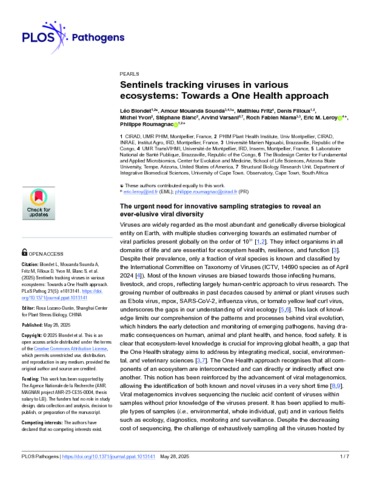 Blondet Leo, Mouanda Sounda Amour, Fritz Matthieu, Filloux Denis, Yvon Michel, Blanc Stéphane, Varsani Arvind, Niama Fabien Roch, Leroy Eric M., Roumagnac Philippe. 2025. Sentinels tracking viruses in various ecosystems: Towards a One Health approach. PLoS Pathogens, 21 (5):e1013141, 7 p.