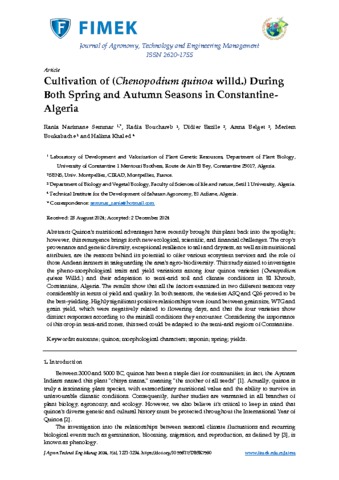 Semmar Rania Narimane, Bouchareb Brahim, Bazile Didier, Belget Asma, Boukabache Meriem, Khaled Halima. 2025. Cultivation of (Chenopodium quinoa willd.) during both spring and autumn seasons in Constantine - Algeria. Journal of Agronomy, Technology and Engineering Management, 7 (6) : 1221-1234.