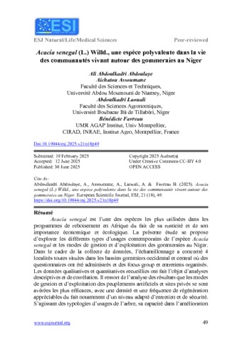 Abdoulkadri Abdoulaye Ali, Assoumane Aichatou, Laouali Abdoulkadri, Favreau Bénédicte. 2025. Acacia senegal (L.) Willd., une espèce polyvalente dans la vie des communautés vivant autour des gommeraies au Niger. European Scientific Journal, 21 (18) : 49-70.