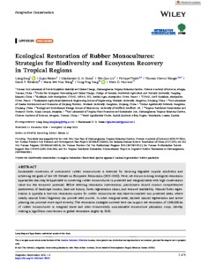 Résumé : Sustainable conversion of uneconomic rubber monocultures is essential for restoring degraded tropical rainforests and achieving the goals of the UN Decade on Ecosystem Restoration (2021–2030). Here, we discuss existing ecological restoration approaches that may be applicable to converting rubber monocultures in protected and marginal areas with high conservation value but less economic potential. Before selecting restoration interventions, practitioners should conduct comprehensive assessments of landscape context, land-use history, forest regeneration status, and resource availability. Natural forest regeneration is typically a low-cost restoration option for rubber monocultures that have encroached into protected areas, where nearby natural forest fragments can provide seed sources. In other marginal areas, assisted natural regeneration and active planting can promote more rapid recovery. The restoration strategies outlined here can support the restoration of 1,900,000 ha of rubber monocultures in marginal zones and other economically unsustainable monoculture plantation crops, thereby making a significant contribution to global restoration targets by 2030.