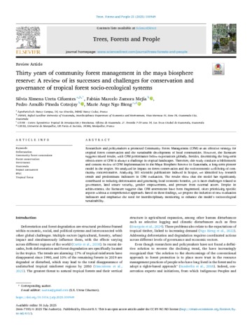 Ureta Cifuentes Silva Ximena, Zamora Mejía Fabián Marcelo, Pineda Cotzojay Pedro Arnulfo, Ngo Bieng Marie-Ange. 2025. Thirty years of community forest management in the maya biosphere reserve: A review of its successes and challenges for conservation and governance of tropical forest socio-ecological systems. Trees, Forests and People, 21:100949, 13 p.