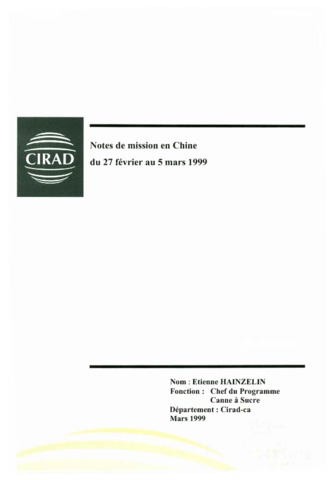 Hainzelin Etienne. 1999. Notes de mission en Chine du 27 février au 5 mars 1999. Montpellier : CIRAD-CA, 34 p.