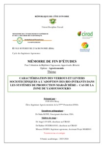 Caractérisation des verrous et leviers sociotechniques à l'adoption des bio-intrants dans les systèmes de production maraîchère : cas de la zone de Yamoussoukro. Fofana Mory. 2024. Yamoussoukro : INPHB, 71 p. Mémoire DAA : Agréconomie : Institut national polytechnique Félix Houphouët-Boigny