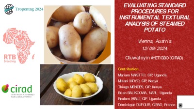 Evaluating standard procedures for instrumental textural analysis of steamed potato: Relationship with sensory parameters. Nakitto Mariam, Moyo Mukani, Mendes Thiago, Balikoowa Brian, Ssali Reuben Tendo, Ayetigbo Oluwatoyin, Mestres Christian, Dufour Dominique. 2024. In : Tropentag 2024: Explore opportunities... for managing natural resources and a better life for all. Book of abstracts. Tielkes Erci (ed.). Witzenhausen : DITSL, Résumé, p. 300. ISBN 978-3-68952-098-4 Tropentag 2024, Vienne, Autriche, 11 Septembre 2024/13 Septembre 2024.