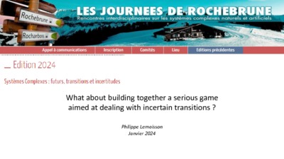 What about building together a serious game aimed at dealing with incertain transitions ? Lemoisson Philippe. 2024. . s.l. : s.n., 39 p. Les journées de Rochebrune / Systèmes complexes : futurs, transitions et incertitudes, Arles, France, 22 Janvier 2024/26 Janvier 2024.