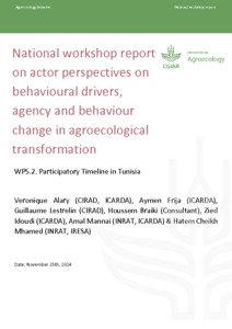 National workshop report on actor perspectives on behavioural drivers, agency and behaviour change in agroecological transformation. WP5.2. Participatory Timeline in Tunisia. Alary Véronique, Frija Aymen, Lestrelin Guillaume, Braiki Houssem, Idoudi Zied, Mannai Amal, Cheikh M’hamed Hatem. 2024. Montpellier : CGIAR, 40 p.